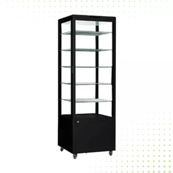 - سيلفت التصميم ذي الجوانب الأربعة الأنظار على الفور، فمع اللون الأسود المصقول و الألواح الأربعة الزجاجية الشفافة التي ستوفر رؤية واضحة من جميع الزوايا للعملاء مع الاحتفاظ بالهواء البارد بالداخل